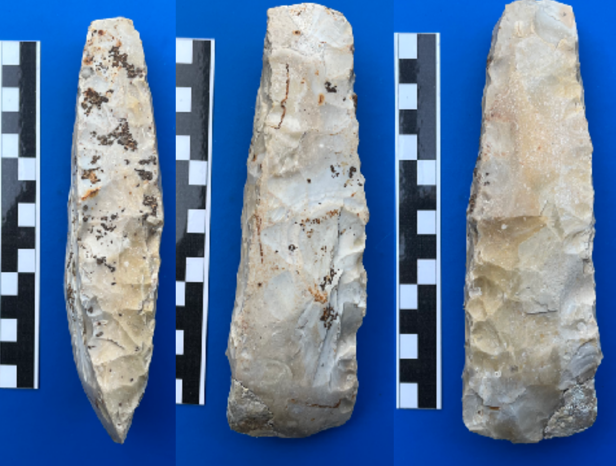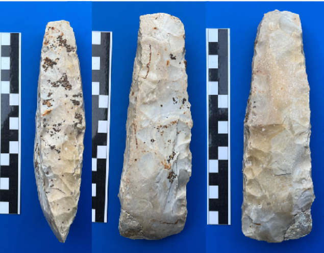 In dit geval komen de vondsten zo goed als zeker uit een van de naast de dijk gelegen huisjes. Want tijdens een volgend bezoek met de experimentalisten aan Denemarken, kreeg ik de kans om in de nabijgelegen akkers te kijken. Daar vond ik geen pronkstukjes maar wel talloze afslagen meteen variatie van patina die exact hetzelfde is als in het rituele depot. Ik fantaseer dat opa deze stenen uit nieuwsgierigheid verzamelde. Want de steentijd is heel populair in Denemarken, de musea liggen vol met duizenden prachtige geslepen bijlen en stenen dolken. Maar dit zijn niet de mooiste exemplaren, dus toen opa dood ging wilden de kleinkinderen ze niet hebben. Gelukkig heeft oma de stenen uit opa’s schuurtje niet in de kliko gegooid. Dat deed ze niet uit idealisme maar omdat alle afval in Denemarken strikt gescheiden wordt, en per kilogram duur betaald. De zuinige oma gooide de stenen in een emmer, liep ermee naar de overkant van de weg en kiepte haar emmer leeg tussen de grote vuursteenblokken op de dijk. Opgeruimd staat netjes. Ik toon hier 29 van de 30 vondsten. Want ik wil één artefact apart bespreken omdat het volgens mij een midden-paleo schaaf is. Midden-paleo is in Denemarken zeldzaam en omstreden omdat Denemarken niet alleen in de Drenthe-ijstijd maar óók in het Laat-Pleniglaciaal (29.000 tot 14.650 jaar geleden) vergletsjerde. Dat is ná de tijd van de Neanderthalers, daardoor hebben die gletsjers het meeste midden-paleo vernietigd of begraven. Het verhaal over die mogelijke midden-paleo schaaf vindt u in de categorie midden-paleolithicum.