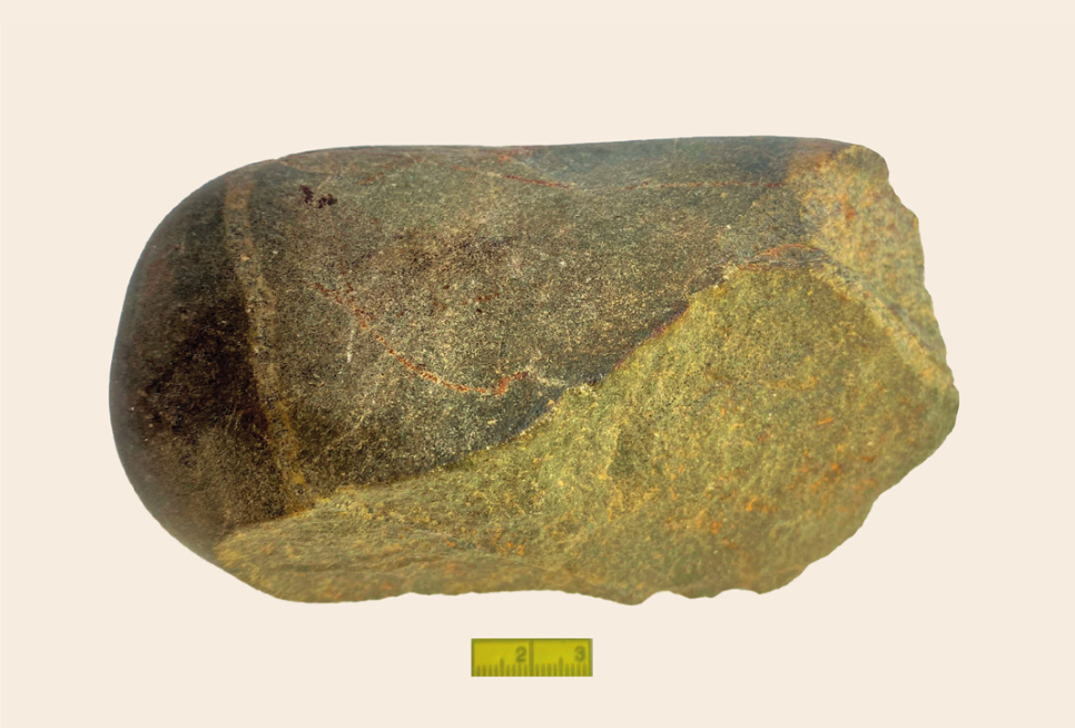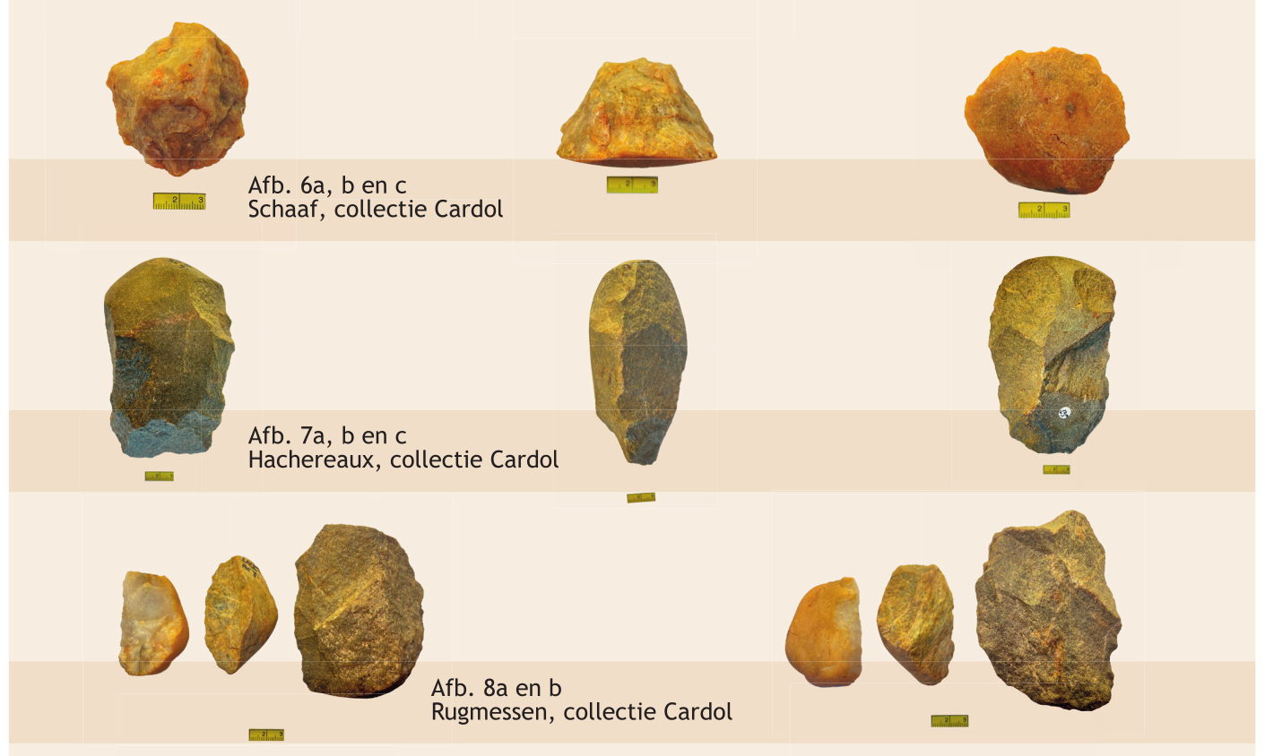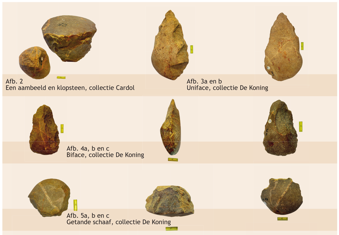 Van dikkere stenen met een min of meer vlakke kant werden op gelijksoortige wijze schaven gemaakt met meerdere afslagen van praktisch 90 graden, ideaal voor dat gebruik. Er zijn meerdere aambeeldstenen gevonden van verschillende formaten die boven beschreven bewerkingstechniek illustreren. Er is één slagsteen gevonden van een formaat en gewicht dat geschikt lijkt voor de se- cundaire bewerking van de artefacten (zie afb. 2). Opvallend is dat de meeste werktuigen nog delen van de onbewerkte buitenkant van de steen hebben. De vorm van het basismateriaal, de rolsteen, blijkt regelmatig bepalend voor de vorm van het werktuig. Het overgrote deel van de werktuigen bestaat uit kernwerktuigen. Werktuigen op afslagen zijn veel minder vaak voorkomend. Een ander opvallend kenmerk van de verzamelde artefacten is dat de meeste niet of nauwelijks gerold, opgelost of anderszins verweerd zijn.