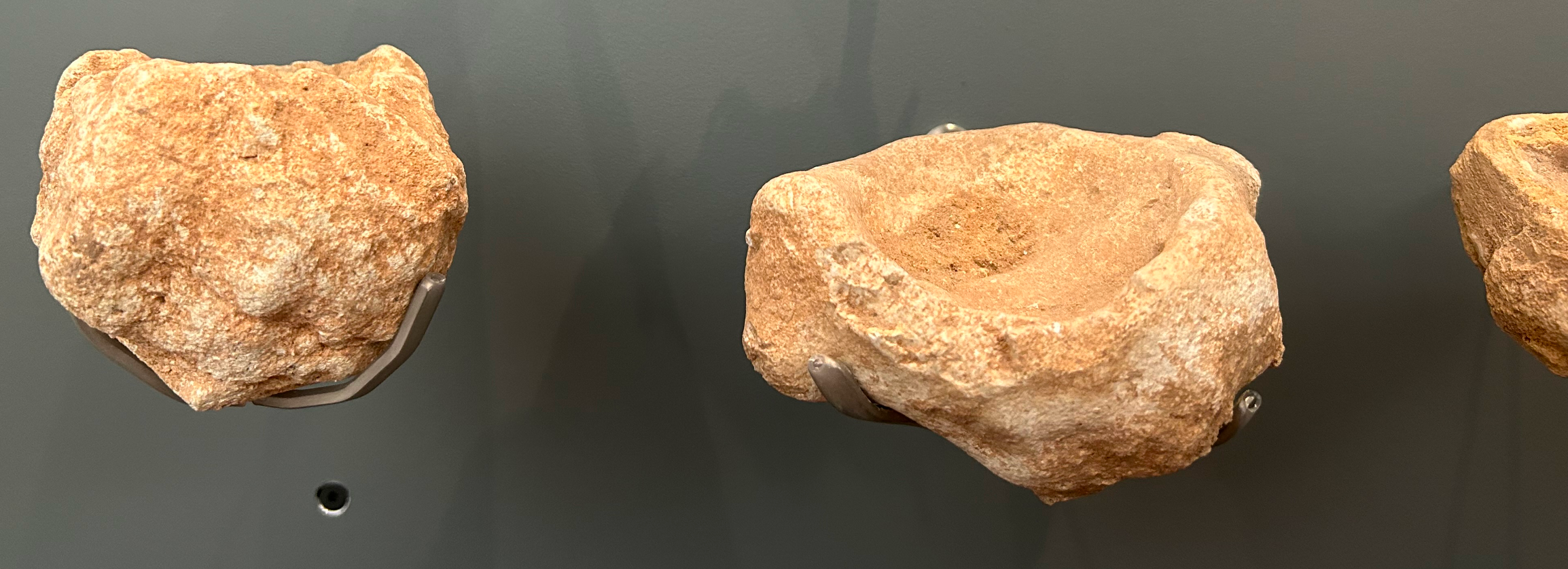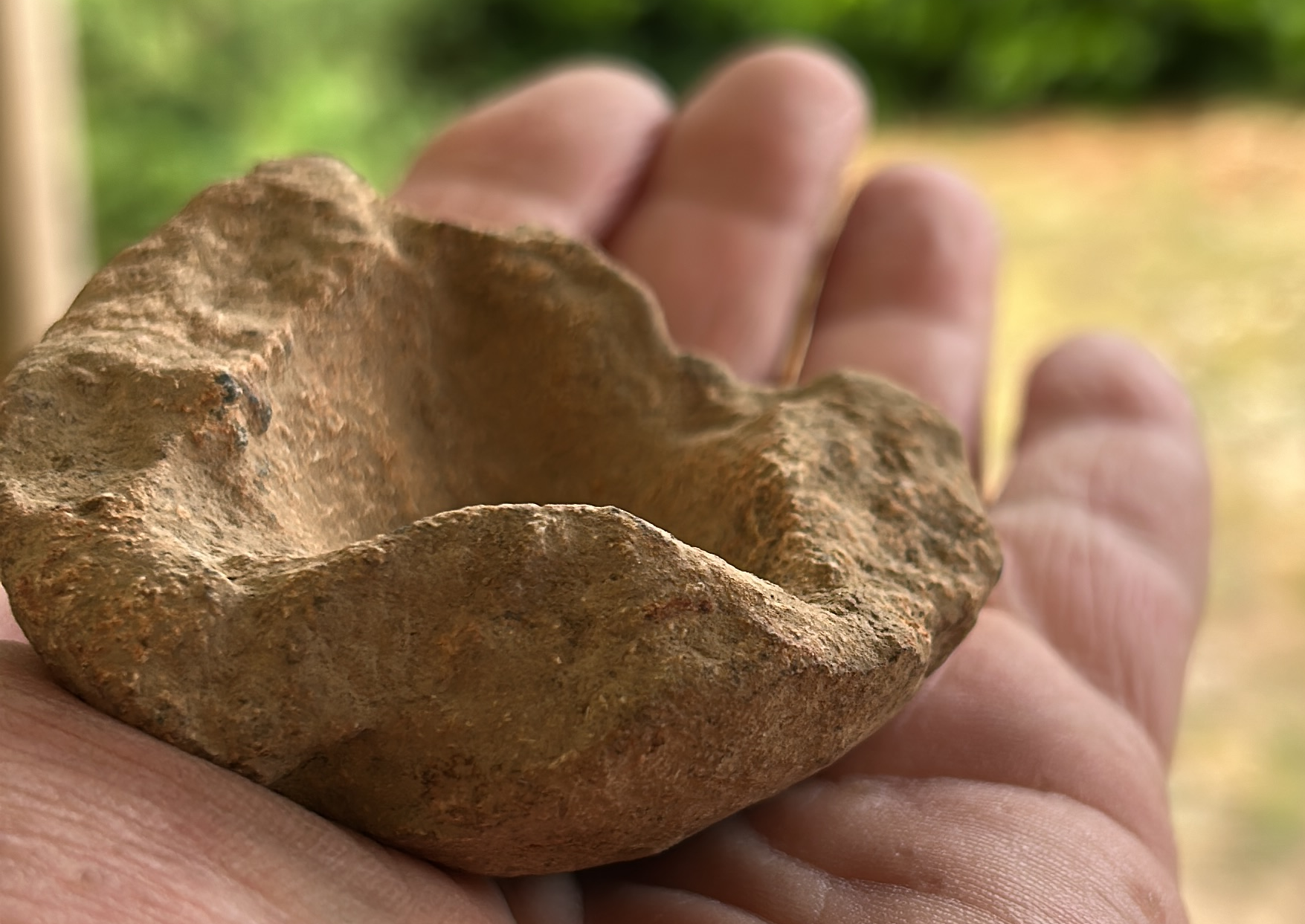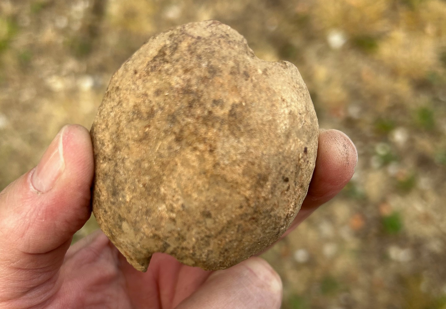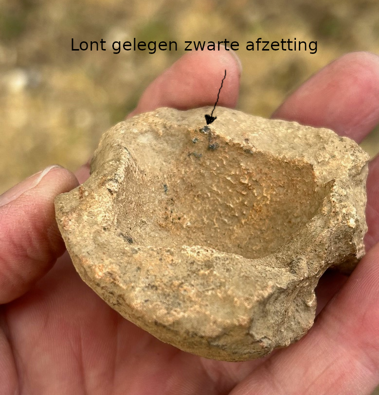 Gevonden op een akker in de omgeving Bassillac et Auberoche, zuid-Frankrijk, Juli 2025. Deze kalksteen lamp vertoont deels een roze verkleuring in de steen door hitte en heeft lichte zwarte roetafzetting in de door de lont aan de rand. En behoord tot de zeldzame 7,5% openlucht vondsten van deze kalksteen lampen. Er zou vet in de holte hebben gezeten, met gras, mos of hout als lont.