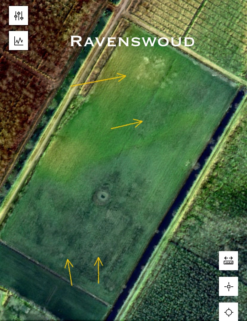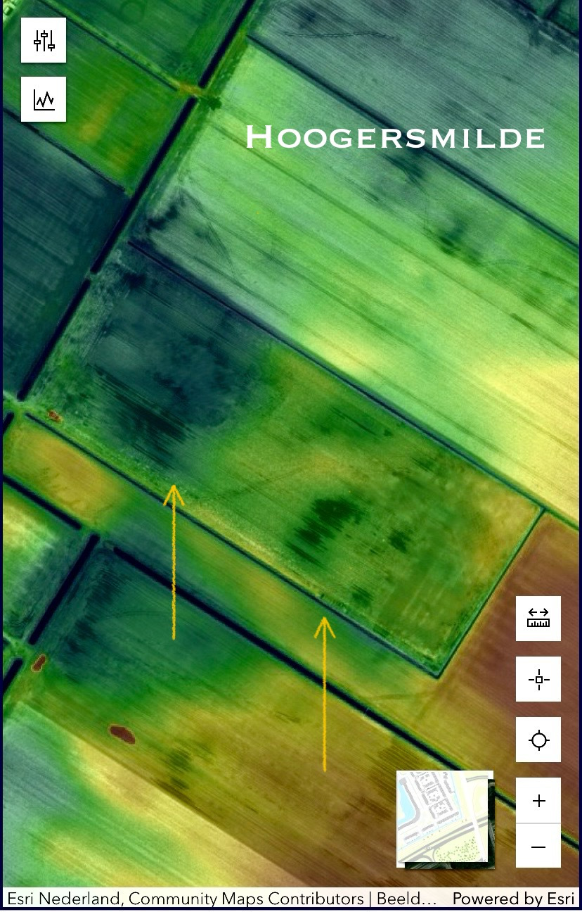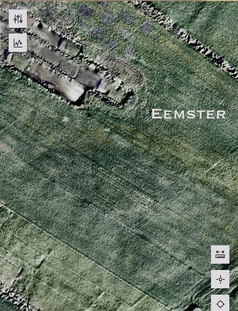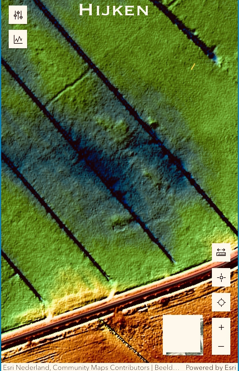 Een belangrijk hulpmiddel hierbij is de hillshade-laag van het AHN. Deze laag is een schaduwkaart van het Nederlandse landschap, gebaseerd op het Actueel Hoogtebestand Nederland (AHN). Hoewel het AHN zelf alleen hoogtegegevens bevat, wordt in de hillshade een virtuele lichtbron gesimuleerd. Zo komen hoogteverschillen als lichte en donkere zones naar voren. In combinatie met luchtfoto’s maakt dit subtiele reliëfverschillen – zoals kuilen, greppels of oude structuren – goed zichtbaar, waardoor archeologen patronen van menselijke activiteit eenvoudig kunnen herkennen.
