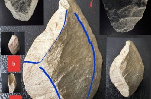 Ik las het boek De Eerste mensen in de Lage Landen van Gerrit Dusseldorp en Yannick Raczynski-Henk. Bij het lezen zag ik een afbeelding van vuistbijlen van olifantenbot. Toen ging mijn herinnering naar een steen in Drenthe. ( de onderste steen op afbeelding)) Ik lees dan dat dat olifantenbot uit Spanje of Italië ( ik las twee verschillende landen in verschillende artikelen, niet altijd duidelijk) en dat zijn dan vuistbijlen van , van welke menssoort eigenlijk? ( Wat maken we er dit keer eens van.,) , het zou neanderthaler zijn of Heidelbergensis mens. Enfin..je hebt dan zo’n soortgelijke vorm ‘ steen’, waarbij ik niet twijfel aan ook artefact-zijn. En dan denk ik; hoe kan nu zo’n oud artefact daar liggen, dus van vóór het Saalien? Ik dacht altijd: windkanter ( maar dat is niet zo m.i.) Zelf zou het wmb nog wel kunnen een periode vóór het Saalien..als alles wat je aan steen vindt in Drenthe nu eens stamt uit het Elsterien en niet uit Saalien, en dat Saalien eigenlijk het voorstukje is van Weichselien met een zelfde karakteristiek als Weichselien, dus zonder toestroom van stenen en ijbedekking en morene, dan zou de Heidelbergensis mens er ook kunnen liggen qua gebruiksvoorwerpen, want dat is niet weggevaagd door Saalien gletsjer.. De Elsterien laag ligt volgens mij hoger in veld. Natuurlijk wel geerodeerd door winden. Afgedekt met zand , op sommige delen dik, soms dun aanwezig..Dat dekzandverhaal blijf ik ook vaag vinden, daar zitten ook gelovige trekken aan.. dus mag ik ook dromen? Terug naar dat olifantbot vuistbijl ding..ik vind de overeenkomst best aanwezig met onderste ‘steen’ te Drenthe, ook verschillen, maar toch..natuurlijk kun je zeggen; het is geofact, ben je er vanaf, maar ..nee, wel artefact m.i. ..windkanter? Nee, het lijkt wel geschuurd, op de zijde..deed men dit in bepaalde tijden? Ik lees nog wel eens een boek, ik vergelijk, ik heb het gemeld , maar het blijft dan stil..kennelijk resoneert het niet, maar ik koester zo’n steen als mijn grootste schat..wetenschappelijk mag dit niet eens..maar wat mag er wetenschappelijk wel meer niet?, wat achteraf wel kan.. toch *** dat mocht dit hooguit 30000 jaar oud zijn, het dezelfde vorm heeft als iets van honderdduizenden jaren terug..ik heb dit nog met een ‘steen’, die in nabijheid van onderste ‘ steen’ werd aangetroffen. Is het inderdaad jonger dan kan artefact van moderne mens sprekend lijken op Neanderthaler of Heidelbergensis mens. De ‘ steen ‘ is vers ogend, maar term vers is misleidend m.i. Het is niet van vuursteen m.i. andere soort steen.. Dezelfde auteur in dat boek schrijft ook: de Hoge Berg op Texel is ern overblijfsel uit Elsterien,..ik word decennia lang verteld dat het Saalien is…is het een fout in boek, of is het kloppend?…ik hoop het eigenlijk wel, want dan past mijn verhaal ook beter..Dan is die Heidelbergensis laag nog wel aanwezig i.t.t tot andere model waarbij Saalien alles daarvoor overreed..