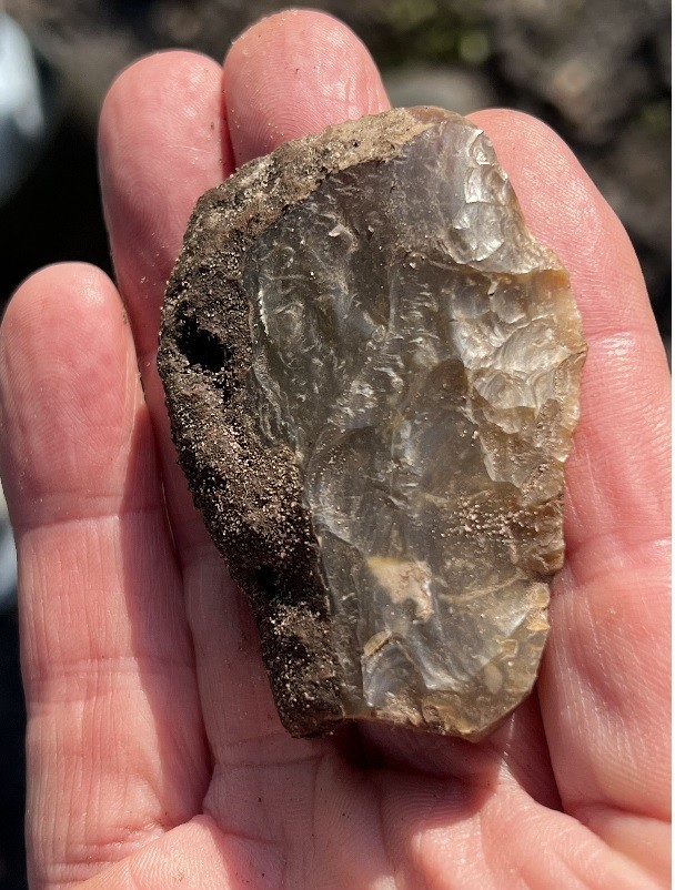 Hier gaat het dus al mis bij uw determinaties. Het artefact is zelfs op 3/4 deel bewerkt. Nu kun je zeggen: de foto is onduidelijk. Ik kan zeggen: de bewerking zit nog vol met keileem. Kan me heel goed voorstellen dat dat ook nog kan hebben geleid tot inkapseling van artefact, waardoor het ongevoelig is geworden voor omstandigheden .