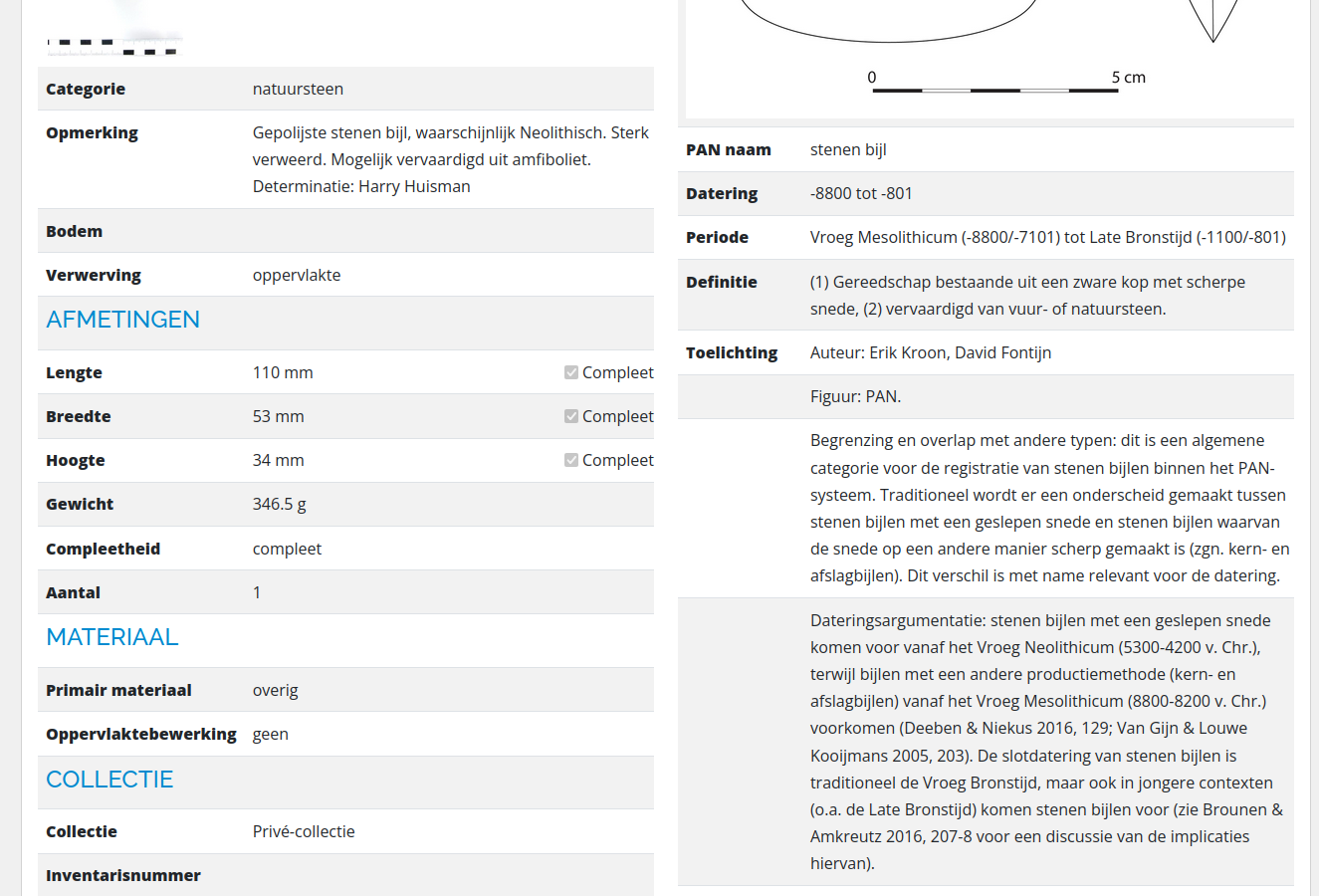 En eerlijk, ik zie er een steen in die op zijn kopse kant in de rivier stroming heeft gelegen is gekanteld om aan de andere kant te worden geslepen. Hebben we dan een werktuigje op basis van het zeldzame steen soort bij schaarste of gebrek aan vuursteen in Nederland tijdens meso/neo/brons? Heden ten dage is het nog vol op te vinden waarom (1) Gereedschap bestaande uit een zware kop met scherpe snede, (2) vervaardigd van vuur- of natuursteen. Dus natuursteen als gepolijste stenen bijl, waarschijnlijk Neolithisch. Sterk verweerd. Mogelijk vervaardigd uit amfiboliet. Determinatie: Harry Huisman. Met bij tekst vervaardigd van vuur- of natuursteen. Toelichting door Auteur: Erik Kroon, David Fontijn. Maak me kek. Zolang het maar wel of niet glimt het maar uit de juiste context komt mag alles door gaan voor een werktuig?