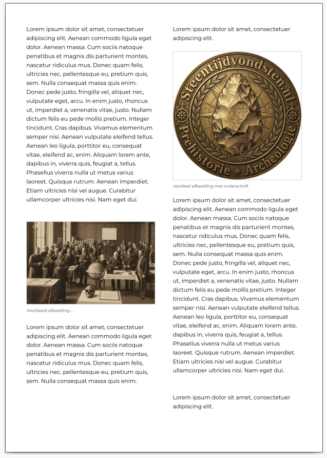 Wil je afbeeldingen gebruiken in een magazine of ontwerp, zoals bij een artikelpagina of redactionele layout? Dan kun je gebruikmaken van deze paginaopmaak in PDF-formaat. Deze opmaak laat zien hoe tekst en afbeeldingen overzichtelijk en aantrekkelijk samen op één pagina kunnen worden geplaatst, zoals in een tijdschriftartikel.